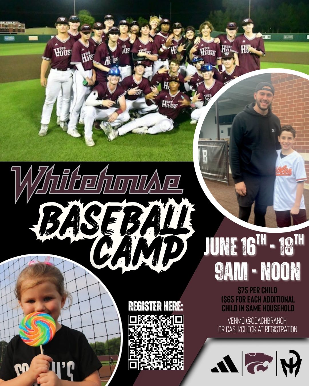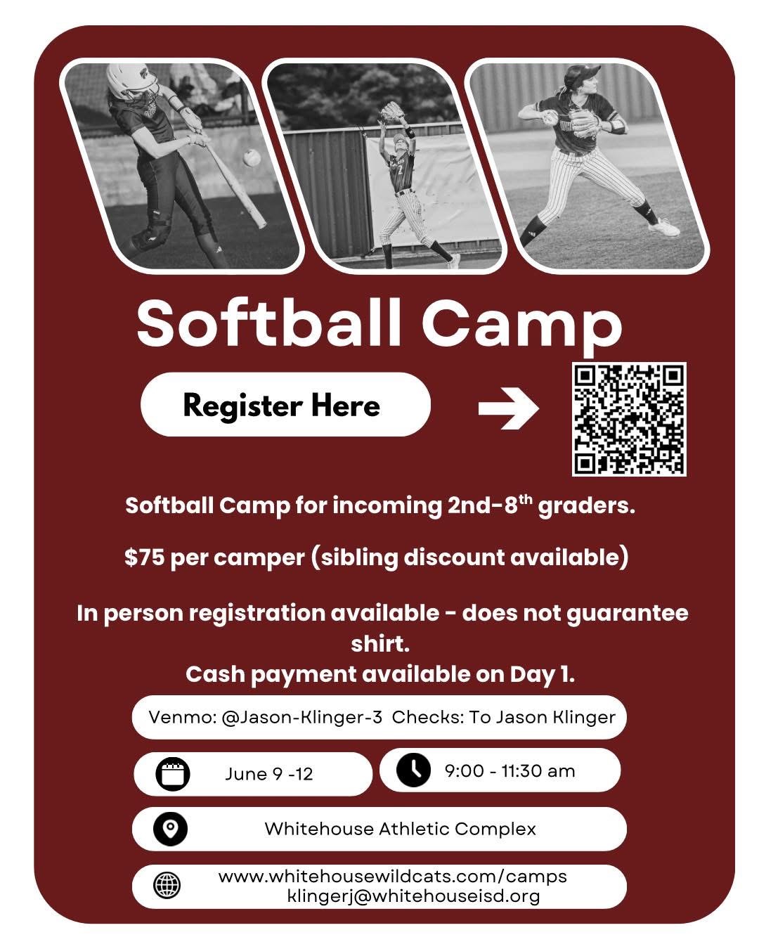 | DESC: | Scan QR code to register Date: June 16th - 18th Location: Whitehouse High School Baseball Field Time/Session: 9:00-12:00 Price: $75 per child (2 children in same household $130) Each camper will receive a Camp T-Shirt Each camper will receive Baseball skills and drills in all aspects of the game from Current Whitehouse Coaches and former players. Each camper will need a glove, all the baseball equipment they have, and water. Venmo @coachbranch or cash/check at registration |