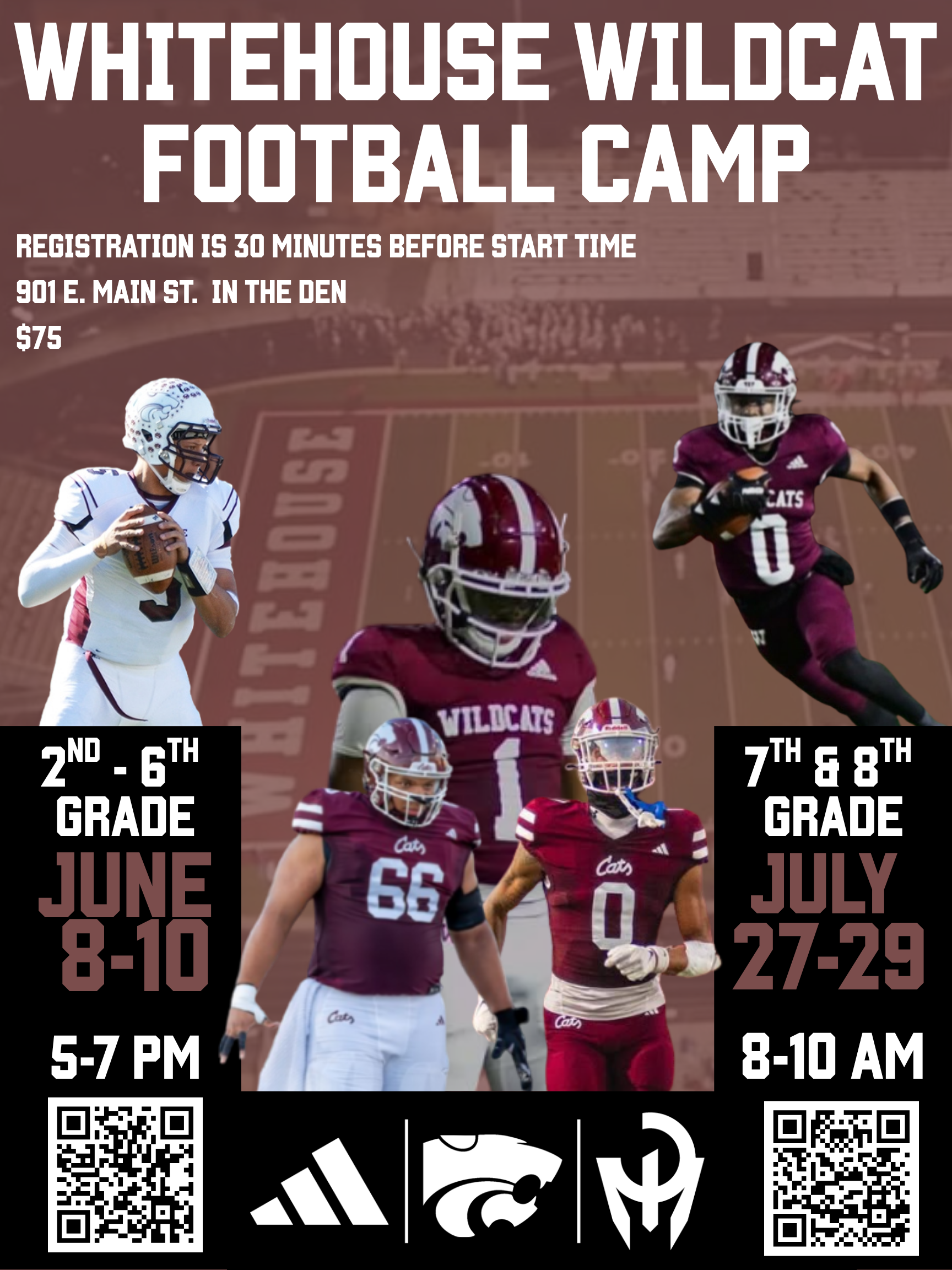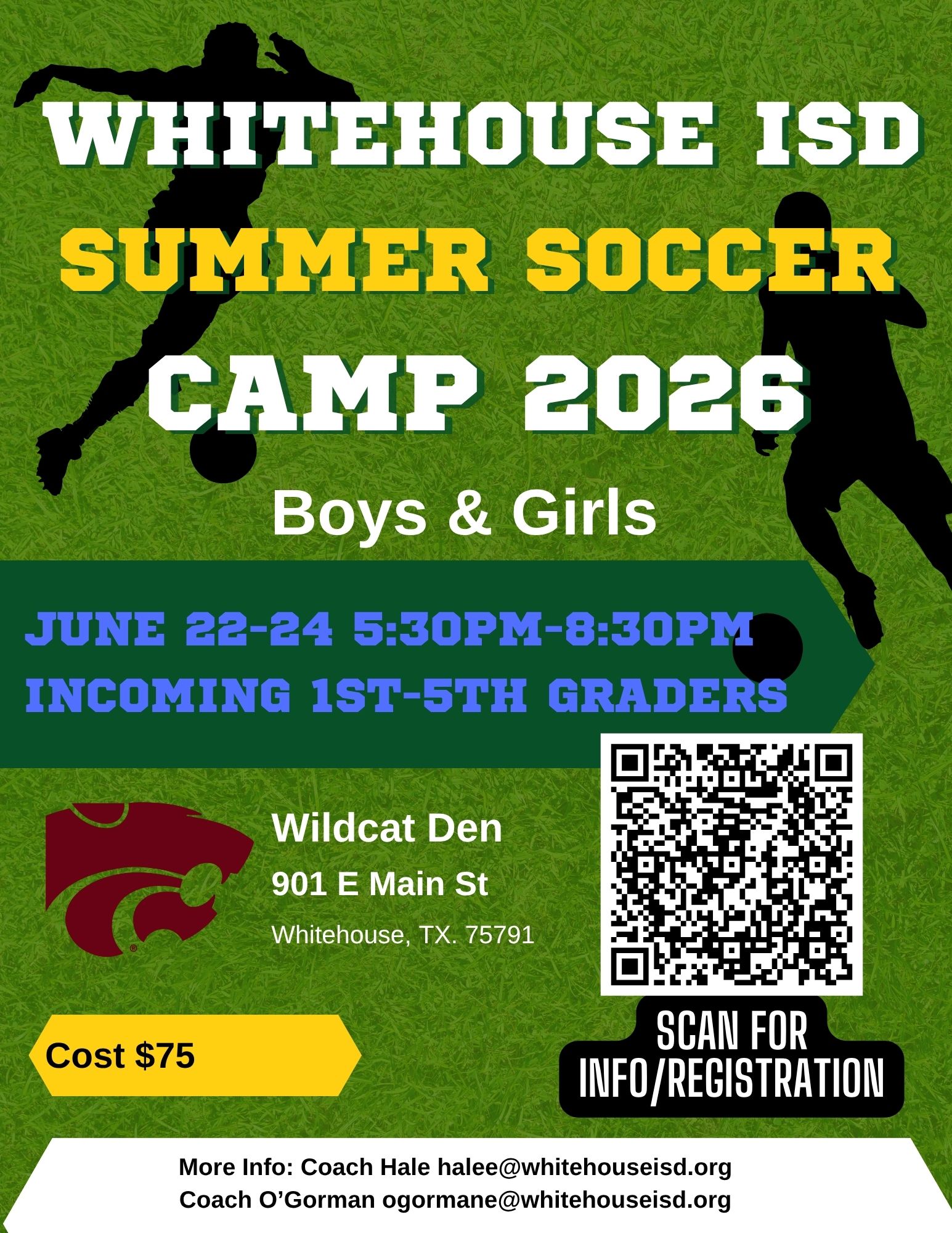 | DESC: | scan QR code on brochure to register June 22nd - June 24th Incoming 1st - 5th graders 5:30 - 8:30 $75 per week Wildcat Den 901 E Main St Whitehouse, TX 75791 |