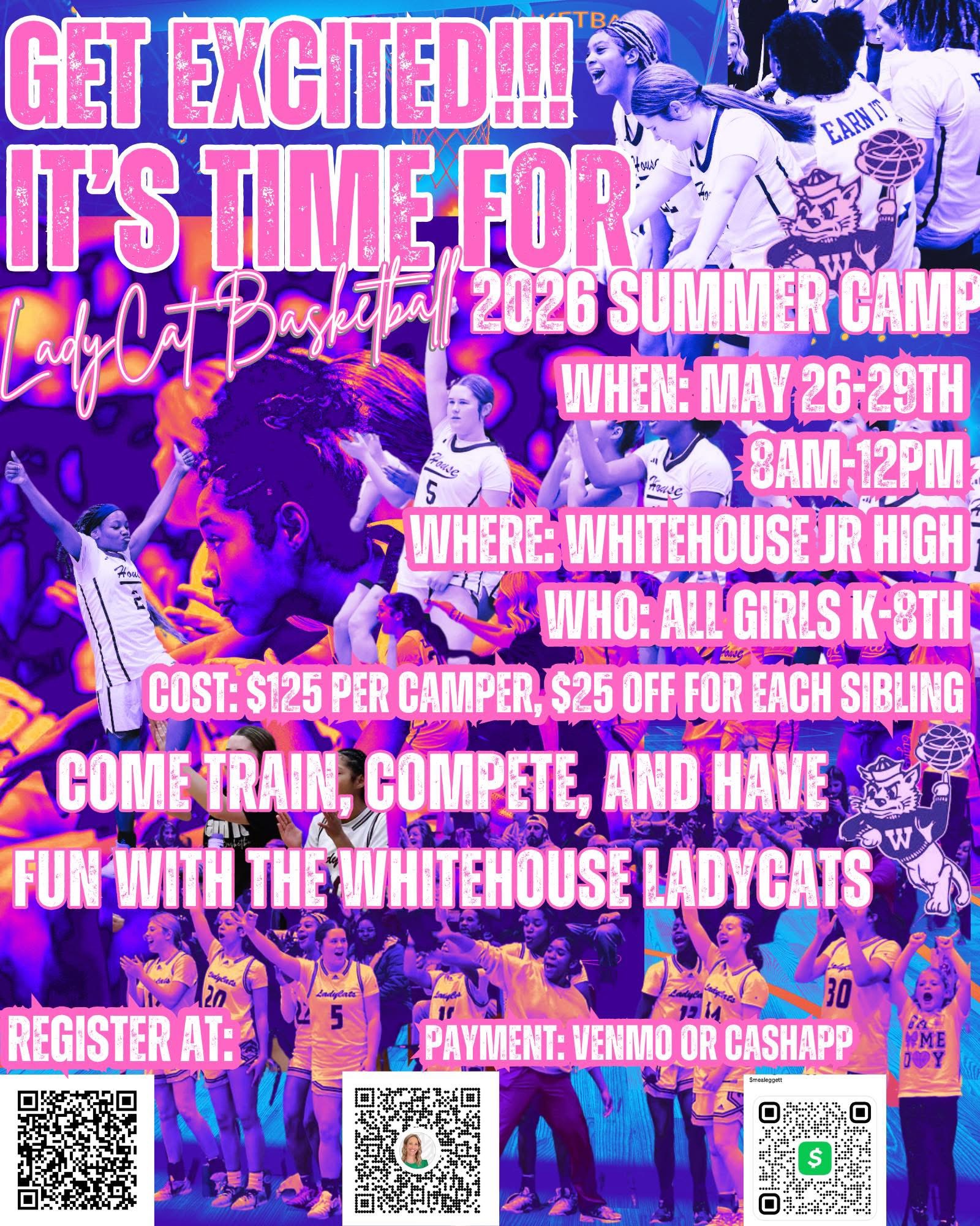 | DESC: | Ladycat Basketball Camp Register and pay by scanning the QR codes on the brochure May 26th - 29th 8:00 - 12:00 $125 per camper, $25 off for each sibling Camp will be at Whitehouse Junior High Gyms All Girls K-8th |