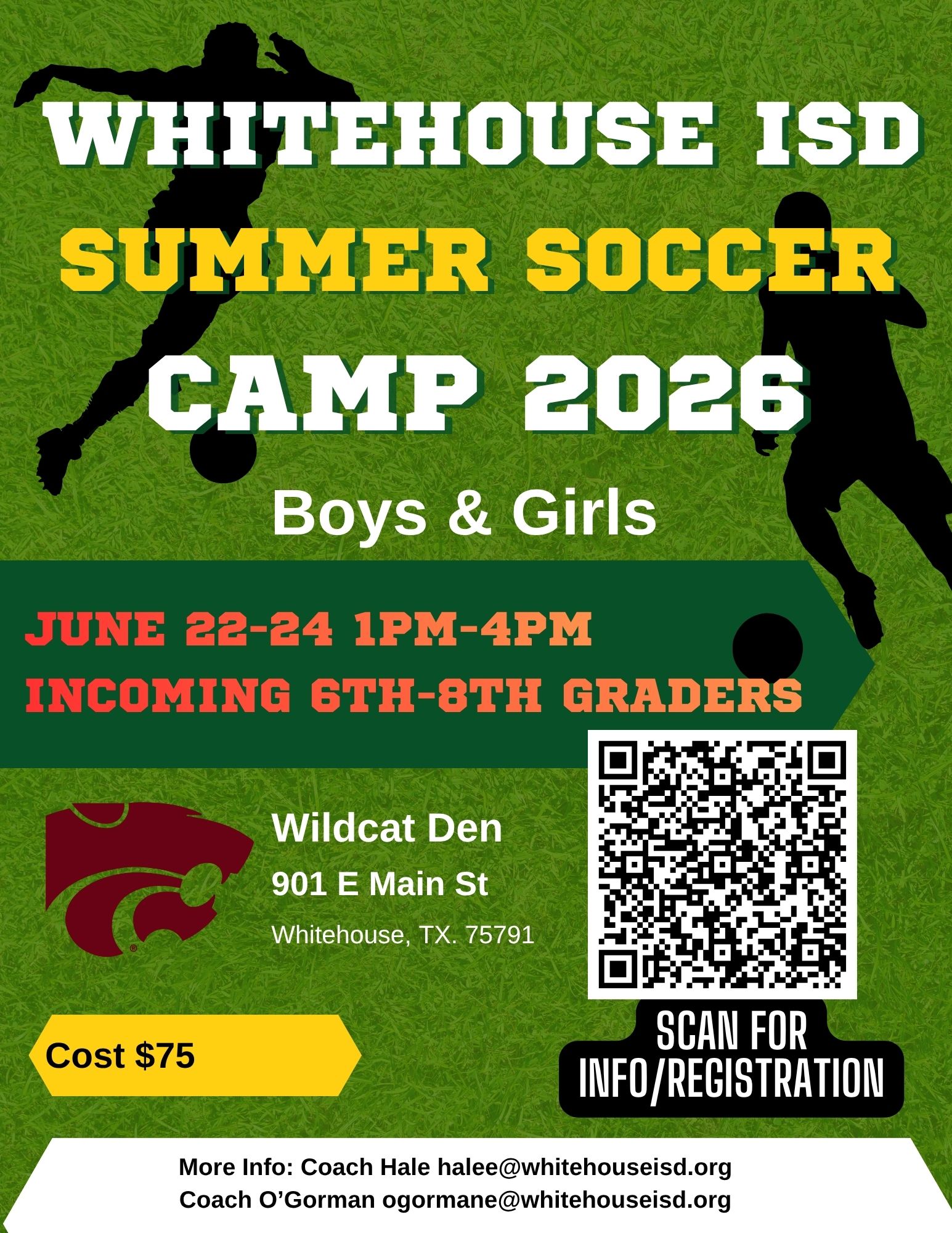 | DESC: | scan QR on brochure to register June 22nd - 24th Incoming 6th - 8th grade 1:00 - 4:00 $75 per week Wildcat Den 901 E Main St Whitehouse Tx 75791 |