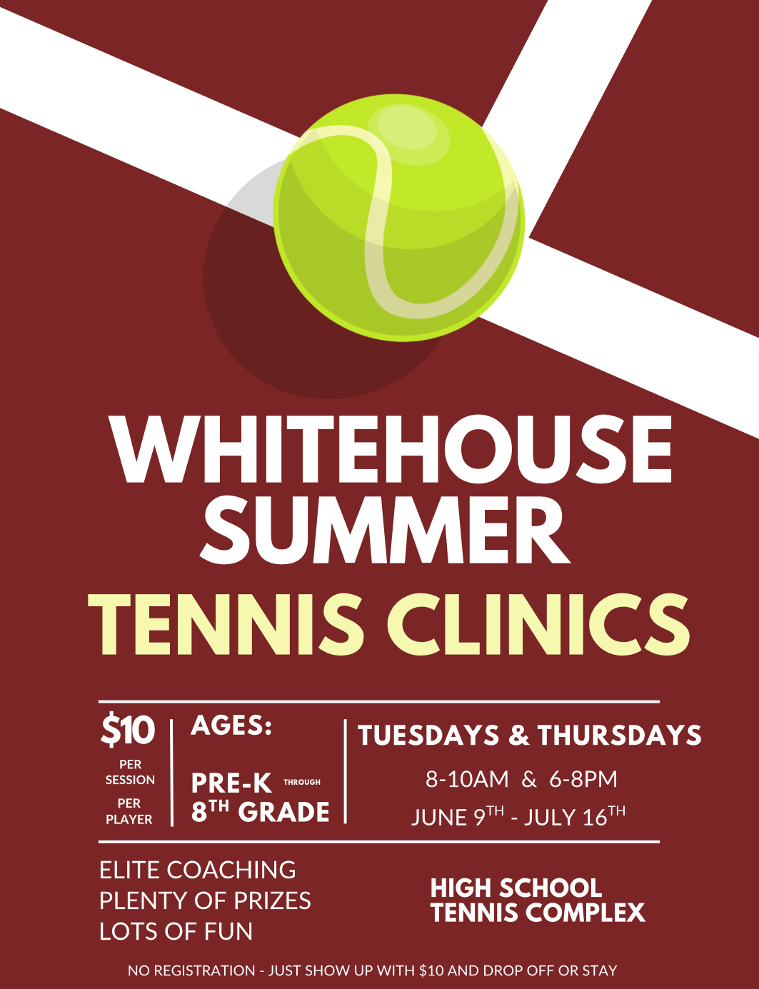 | DESC: | Join our High School coaches for tennis skills and fun! Whitehouse High School courts June 9th - July 16th Every Tuesday and Thursday Session 1: 8am - 10am Session 2: 6pm - 8pm PK - 8th grade $10 per session, per player Open to boys and girls, all levels! $30.00/week or $10/day |