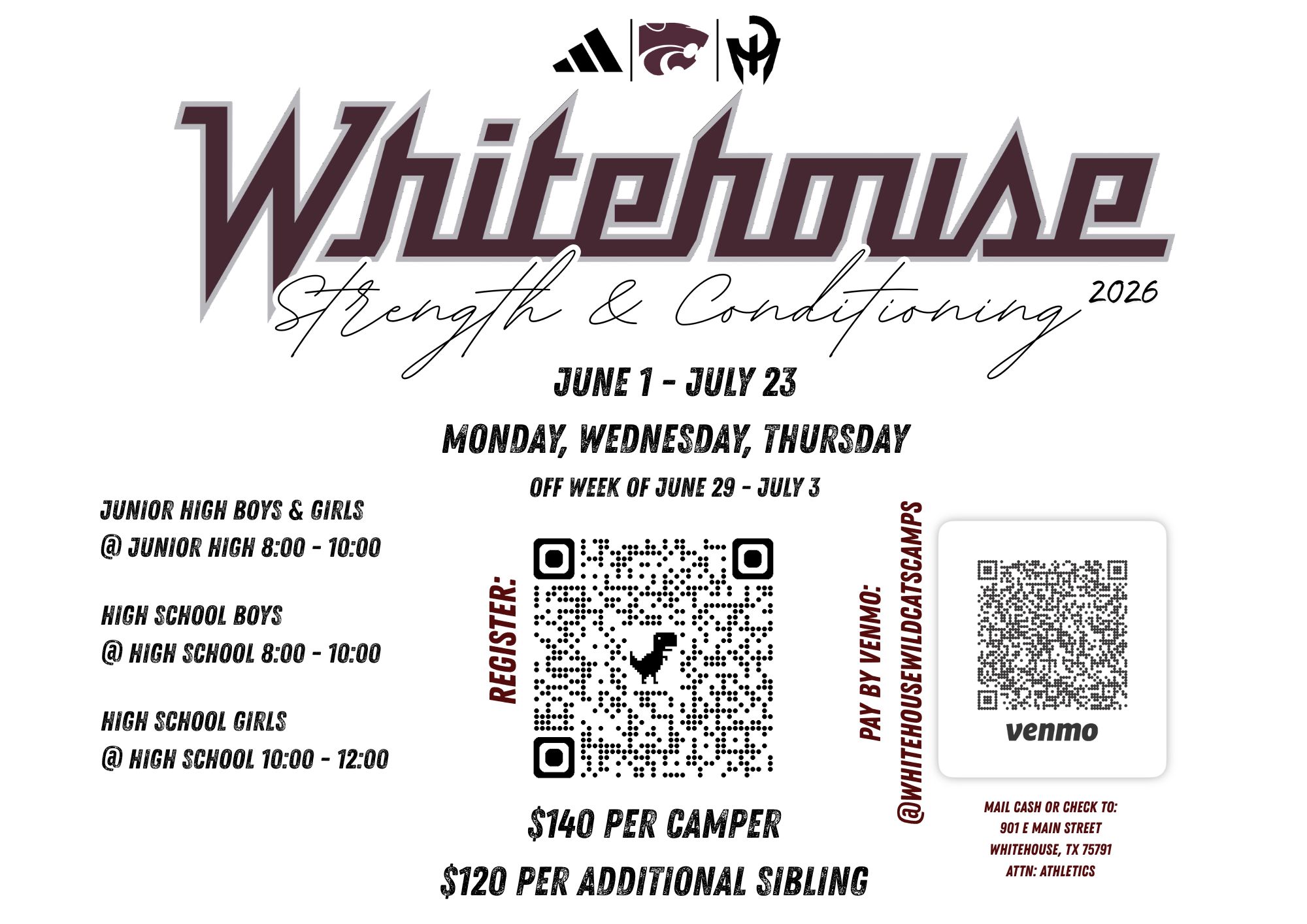 | DESC: | Whitehouse Summer Strength and Conditioning Incoming 7th-8th Graders Where: Whitehouse Junior High School Boys and Girls 8:00 AM - 10:00 AM DATES: June 1st - July 23rd Monday, Tuesday, Thursday OFF: week of June 29 - July 3 |